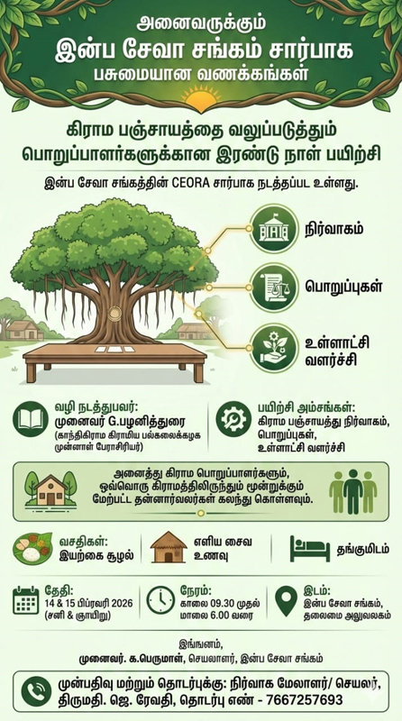 Inba Seva Sangam, ISS, was established by Mother Lea Provo in 1968 under the Tamil Nadu Societies Registration Act. After her husband passed away in Belgium, Mother Lea Provo at the instance of a Gandhian disciple Shantidass (Josseph Jean Lanze del Vasto) of France came to India. She visited Gandhian institutions in Tamil Nadu and finally established the two model villages, Sevapur and Vinobajipuram, to serve the rural people in the manner that was suggested by Mahatma Gandhi. Sevapur and Vinobajipuram are located in beautiful, quiet and natural environment and they are places where one can draw inspiration and manifestation of spirituality. Today's residents of Sevapur och Vinobajipuram